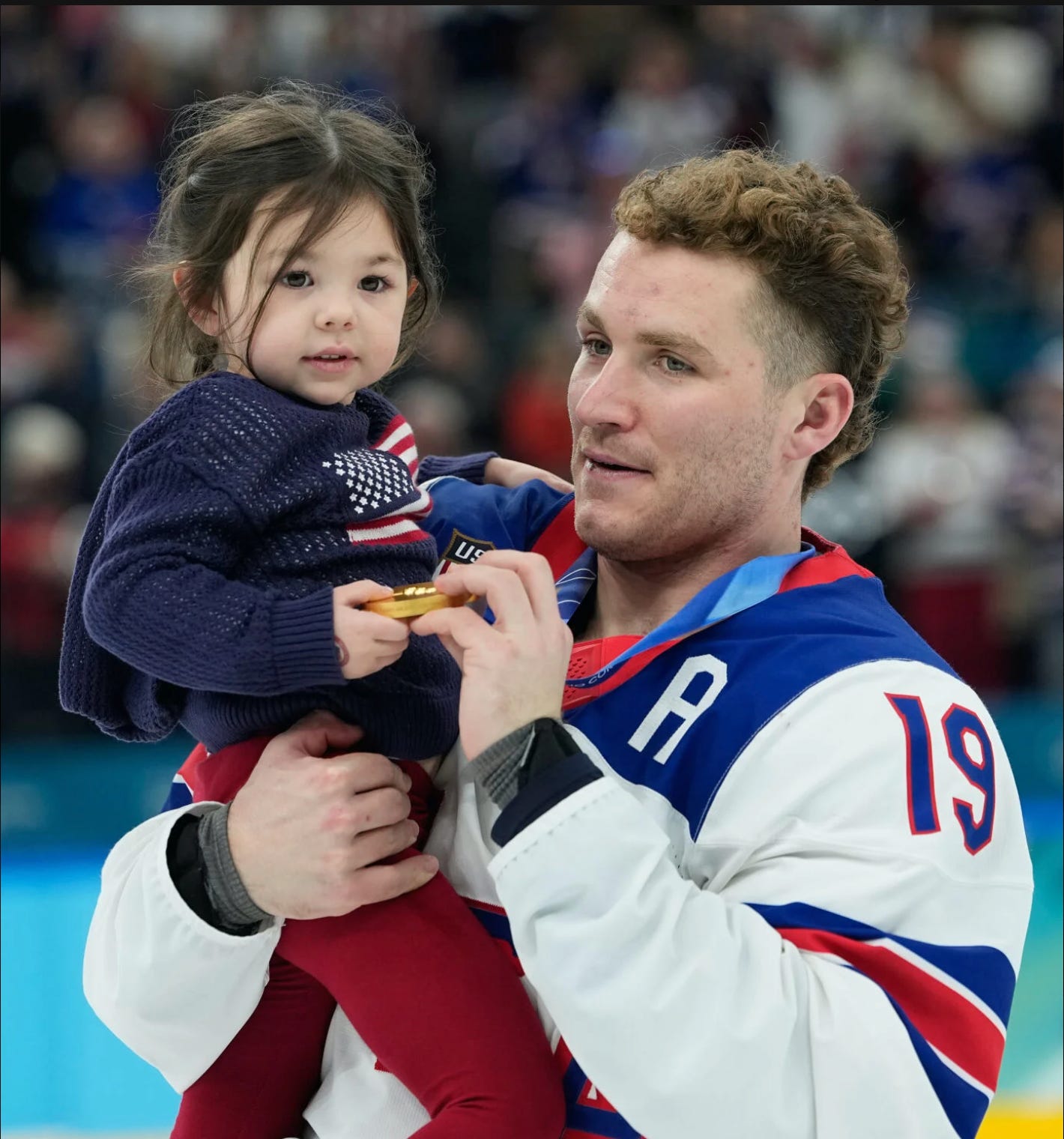 Matthew Tkachuk (19) carried Noa Gaudreau, daughter of their teammate who died in a tragic accident, onto the ice following the men’s ice hockey gold medal game between Canada and the United States. Photo by Petr David Josek The Associated Press