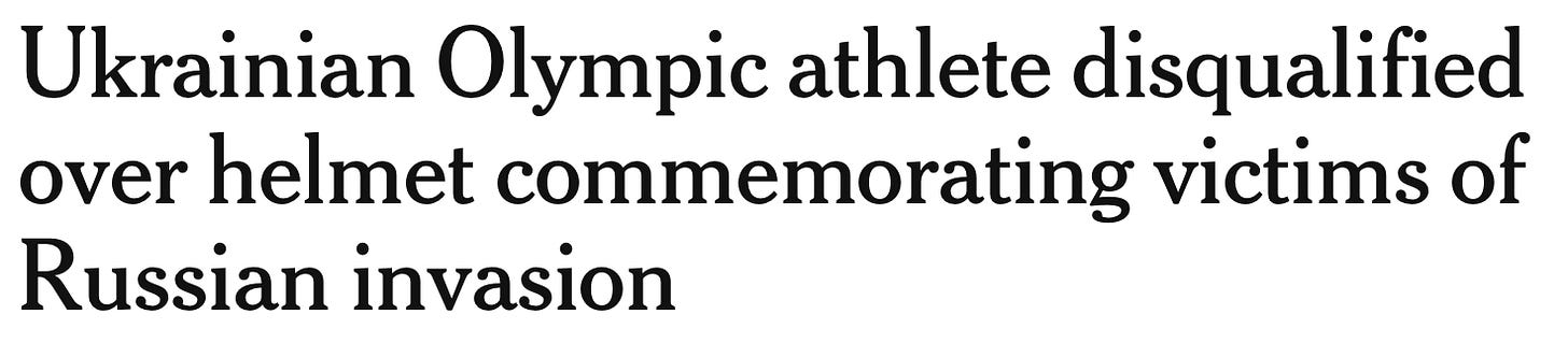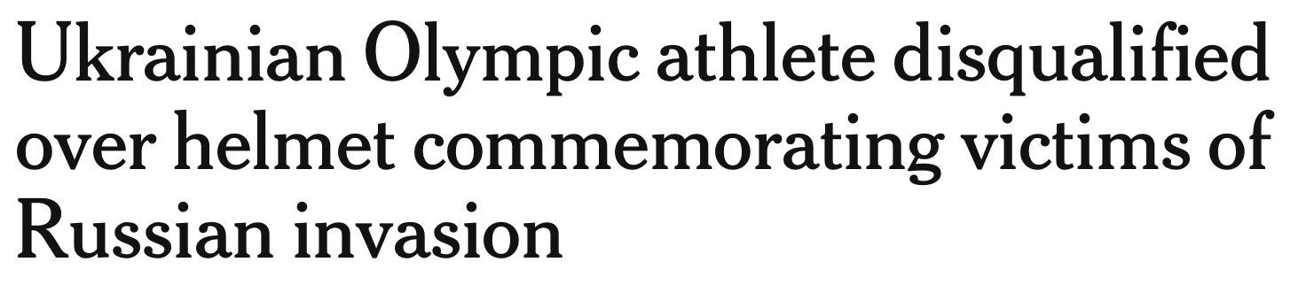 As the Athletic observed: “This was a clash of competing beliefs: Heraskevych’s conviction that expressing grief for fallen athletes, some of whom were close friends, was not a political message; and [IOC president Kirsty] Coventry’s longstanding view that the field of play must be kept free from all messages.”
