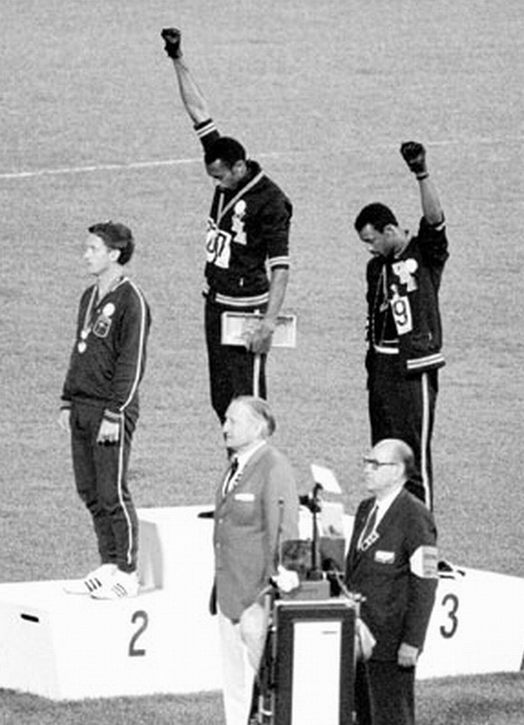 Gold-medal winner Tommie Smith tucked a scarf around his neck symbolizing Black Pride.