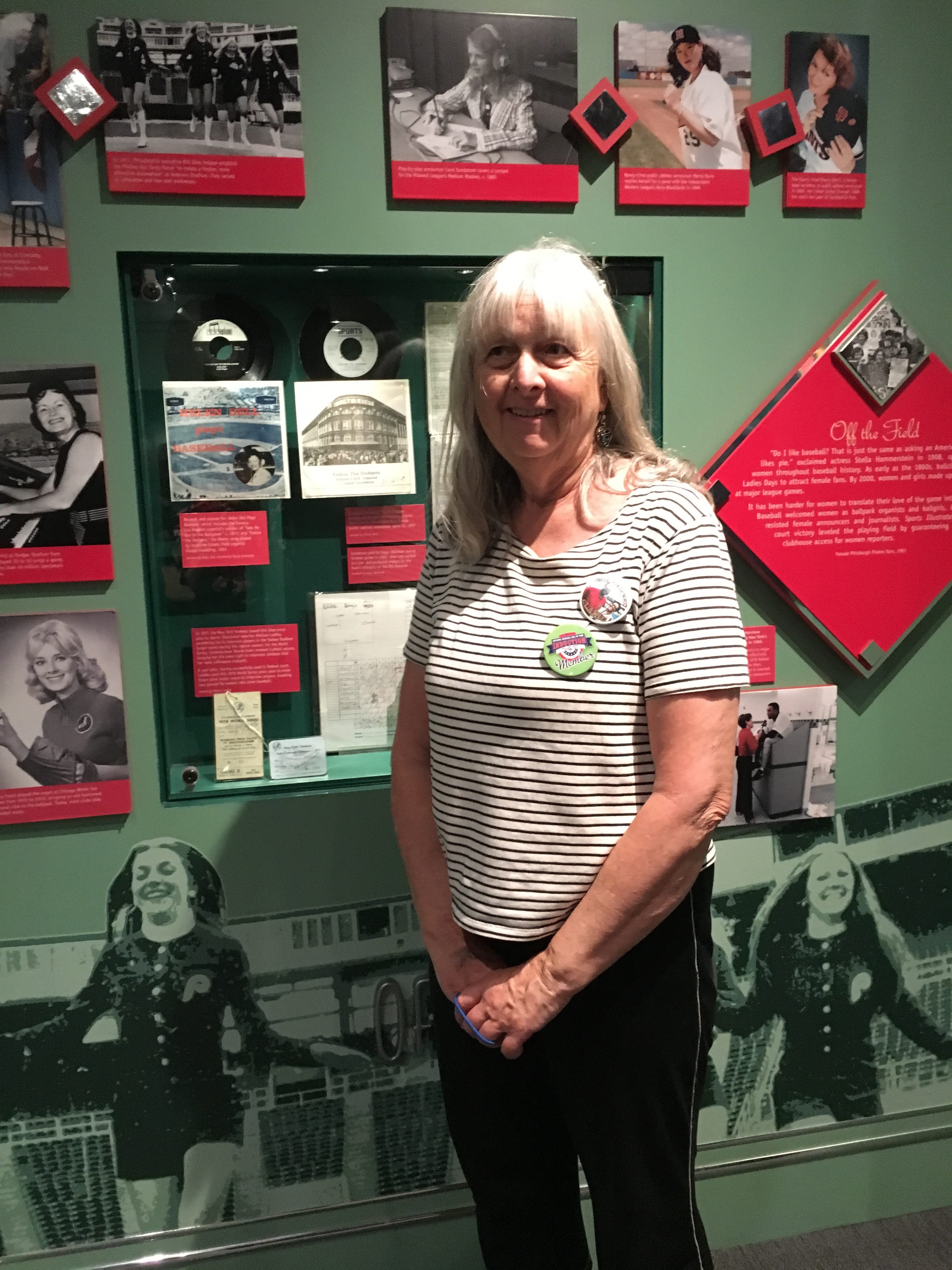 Maya took this photo of me in the Diamond Dreams exhibit standing next to my clubhouse press passes from the 1970s and a description of my victory in the 1978 equal access case against Major League Baseball. We were in Cooperstown in July 2017 to see my friend Claire Smith be honored as the first woman given a plaque in the Hall of Fame. Hers is in with the writers, where all of the rest are still men.
