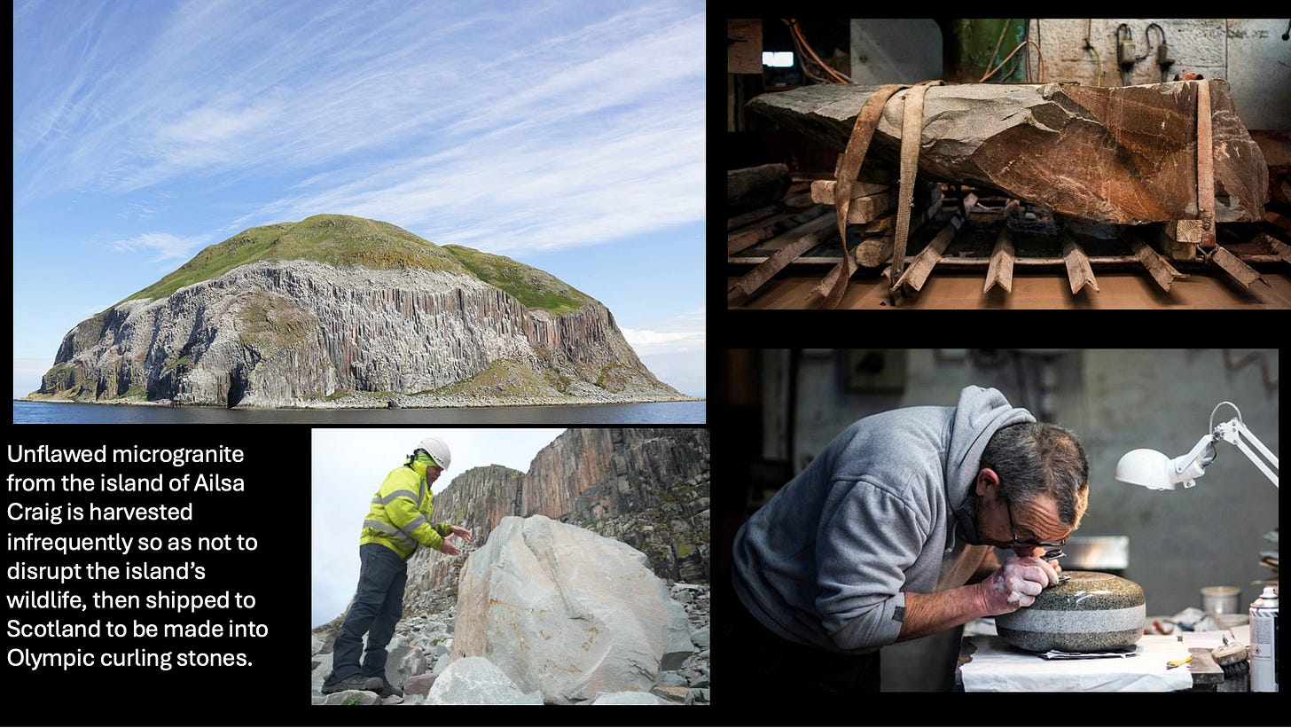 A curling stone is made from a rare micro-granite mined in only two places – the uninhabited island, Ailsa Craig, near Scotland and a quarry in North Wales. All of the Olympic curling stones were made in a small Scottish factory with the granite cut from Ailsa Craig.