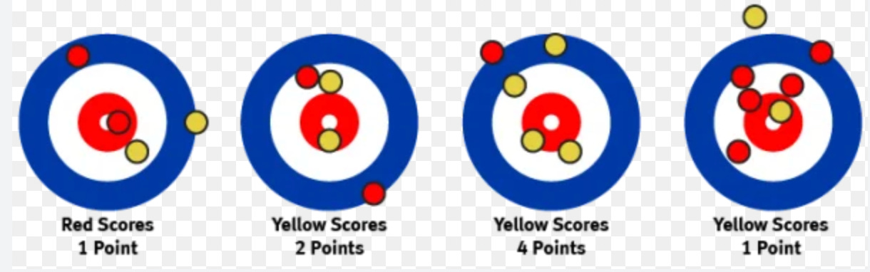 Examples of scoring in curling with stones in “the house” when an “end” is finished.