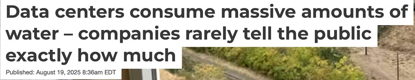 “A 2024 report from the Lawrence Berkeley National Laboratory estimated that in 2023, U.S. data centers consumed 17 billion gallons (64 billion liters) of water directly through cooling, and projects by 2028, those figures could double – or even quadruple. The same report estimated that in 2023, U.S. data centers consumed an additional 211 billion gallons (800 billion liters) of water indirectly through the electricity that powers them. But that is just an estimate in a fast-changing industry.” The Conversation, “Data centers consumer massive amounts of water - companies rarely tell the public exactly how much.”