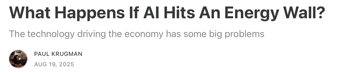 Nobel economist Paul Krugman writing on Substack: “This isn’t about AI causing unemployment by replacing humans. We’re talking instead about the risk of a recession if the current surge in AI-driven investment turns out to be unsustainable. … We also have an additional worry: Will companies spending huge amounts on AI hit the brakes once they realize that they won’t be able to power their data centers? The point is that the mismatch between the immense amounts of electricity data centers are expecting to use and the generating capacity we’re likely to have isn’t just a problem for the companies sinking hundreds of billions into AI. It’s a threat to the economy as a whole.”