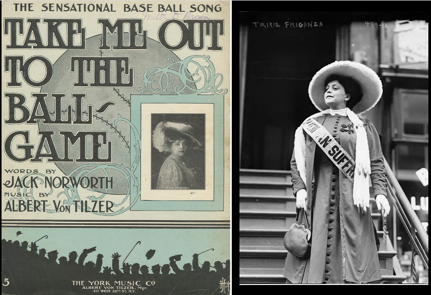 We don’t know if Trixie Friganza, a New York suffragist and vaudeville star, was at the Polo Grounds that day. It’s likely she was since off the stage “she was an influential and prominent suffragist who advocated for women’s social and political equality.”
