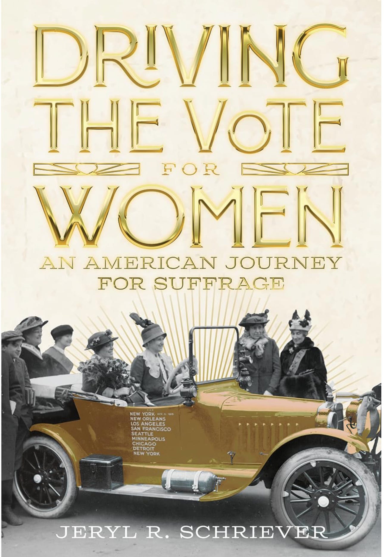 The Golden Flyer II will traverse 25 states as its drivers mobilize voters and motivate Americans to join the national ERA petition drive. [You can join, too, by signing it at Sign4ERA.org.] At each stop, Jeryl Schriever, who wrote Driving the Vote for Women, about Alice and Nell’s rebellious – and within a few years successful – drive to get the women’s right to vote, aka the 19th Amendment, in our Constitution.