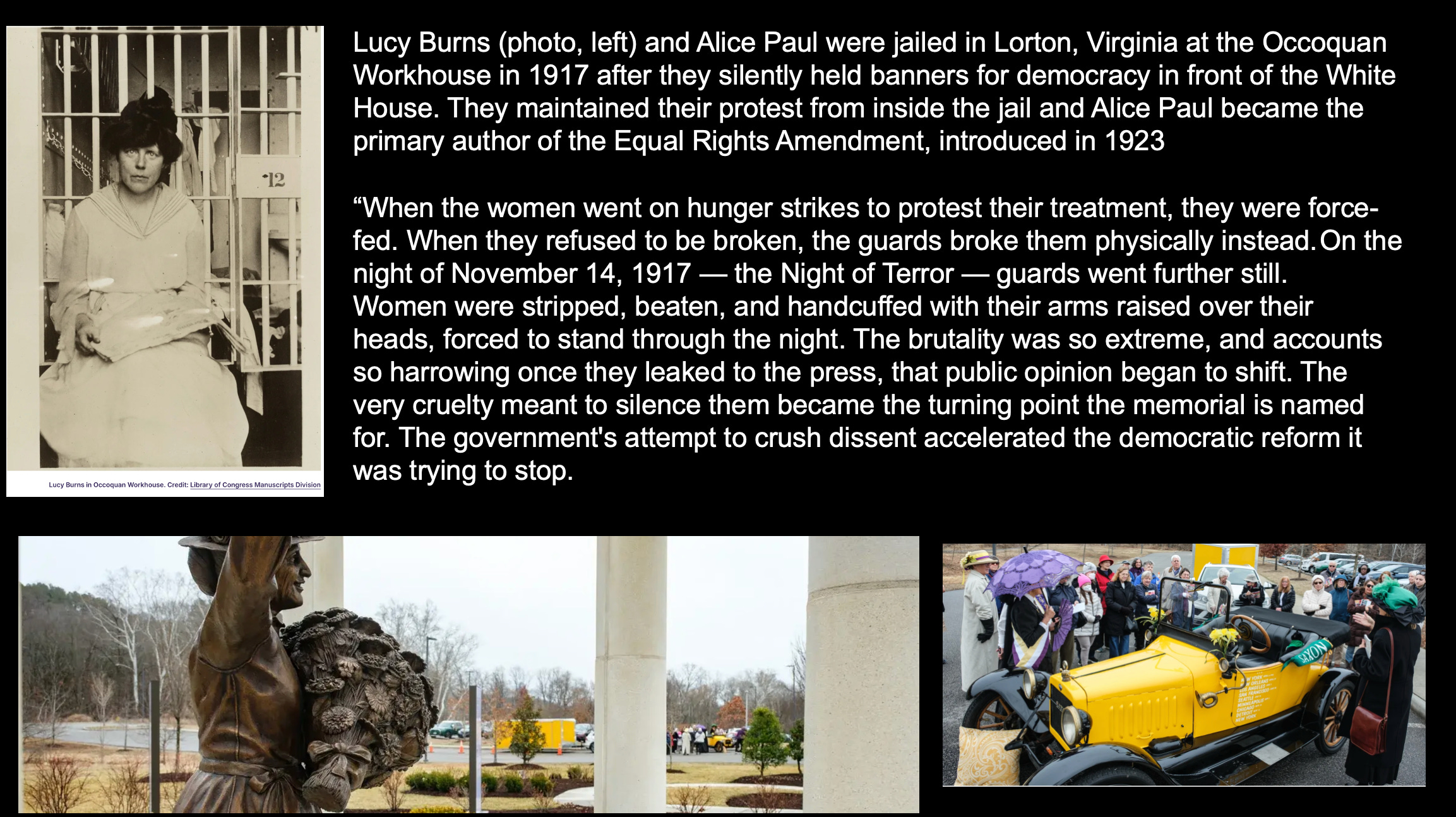 Along the way, the women make stops of remembrance. In Lorton, Virginia, they visited the Turning Point Suffragist Memorial on the grounds of the old Occoquan Workhouse. In 1917, suffragists, ages 19 to 73, were arrested for silently protesting at the White House and brought here to live in filthy and inhumane conditions. Denied contact with family and lawyers. Some endured solitary confinement; many were severely beaten.