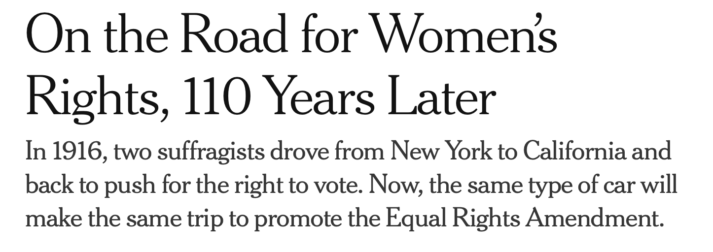 “Ten thousand bumpy, muddy, unmapped miles – facing danger and adventure all alone, with just each other (and a kitten) in their little yellow car.” [“Around America to Win the Vote”]